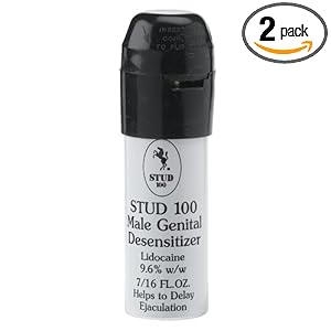 Category: Health & Personal Care Vendor: Case of two 0.43-ounce bottles of male genital desensitizer (total of 0.86 ounces) With lidocaine for reliable results Helps to Product Description : Stud 100 male genital desensitizer helps to delay ejaculation. Active ingredient is lidocaine.